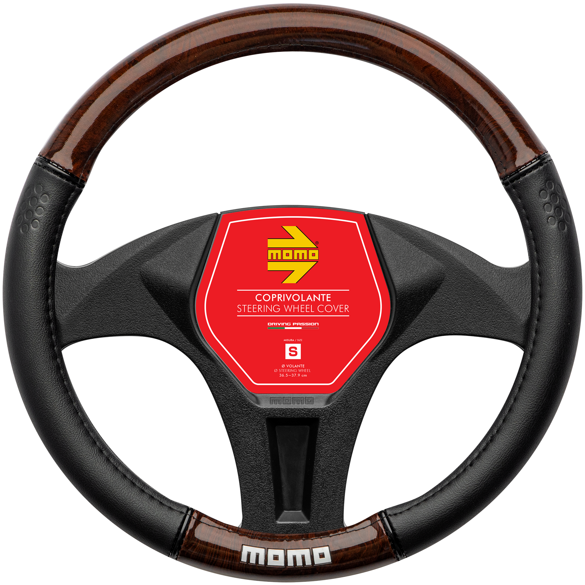 With a combination of black polyurethane and briar look wood, it is finished with black stitching and a white MOMO logo at the bottom centre position.