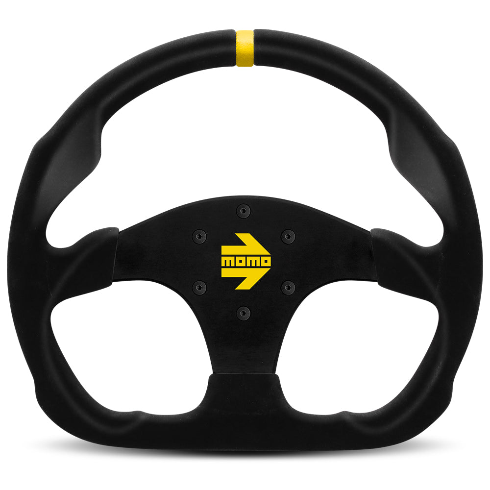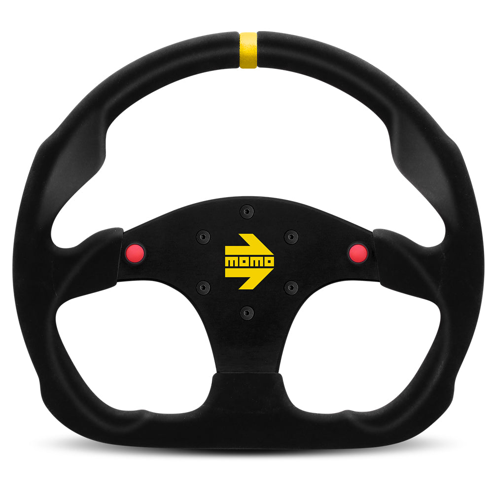 The flat bottom allows for easier access into the cockpit and a yellow leather marker at the top to provide the driver with a quick reference to the steering position. Finished in black suede, the steering wheel features black aluminium spokes, an anatomical grip for increased comfort, and the yellow MOMO logo in the centre. Available in 2 styles - with or with the 2 red buttons