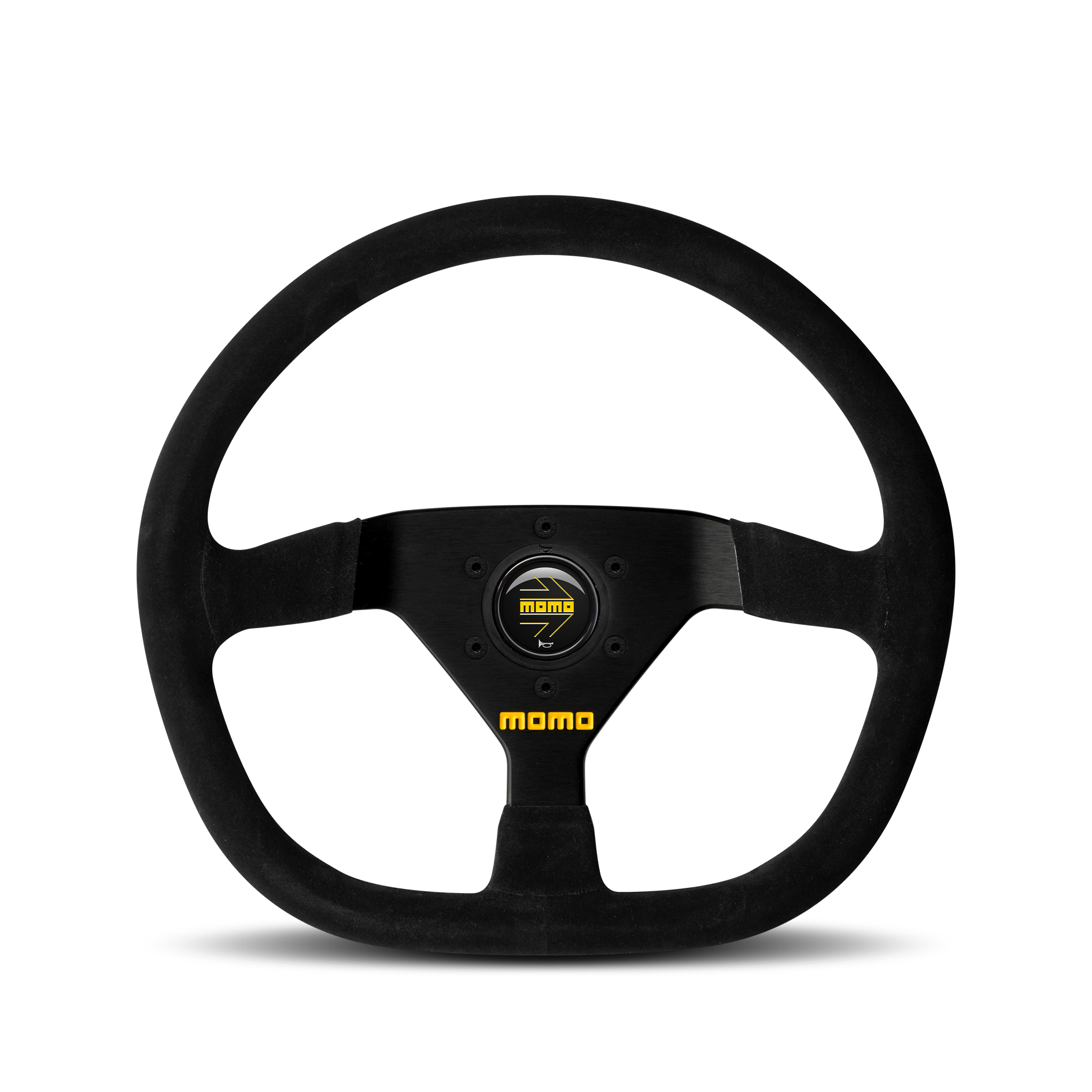 Features include a flat bottom for increased access and comfort in the cockpit. Finished in black suede, the black aluminium spokes feature a yellow MOMO logo and MOMO Italy horn push button in the centre. All MOMO racing steering wheels are produced in Italy to the highest quality with anticorodal aluminium frames. The suede covering is glued to the rim, instead of being stitched, to provide a seamless finish for greater comfort and durability.